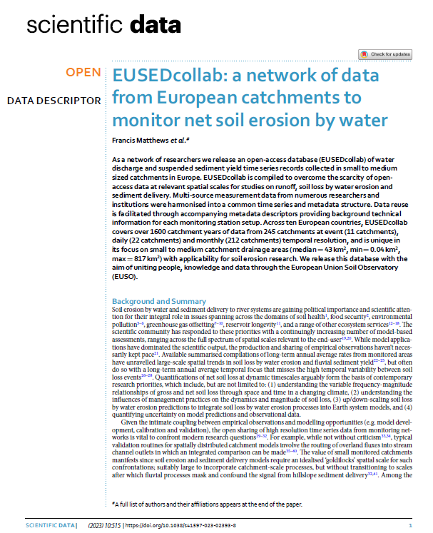 Matthews F., Verstraeten G., Borrelli P., Vanmaercke M., Poesen J., Steegen A., Degré A., Rodríguez B.C., Bielders C., Franke C., Alary C., Zumr D., Patault E., Nadal-Romero E., Smolska E., Licciardello F., Swerts G., Thodsen H., Casalí J., Eslava J., Richet J.-B., Ouvry J.-F., Farguell J., Święchowicz J., Nunes J.P., Pak L.T., Liakos L., Campo-Bescós M.A., Żelazny M., Delaporte M., Pineux N., Henin N., Bezak N., Lana-Renault N., Tzoraki O., Giménez R., Li T., Zuazo V.H.D., Bagarello V., Pampalone V., Ferro V., Úbeda X., Panagos P. 2023. EUSEDcollab: a network of data from European catchments to monitor net soil erosion by water. Sci Data 10, 515. DOI: 10.1038/s41597-023-02393-8