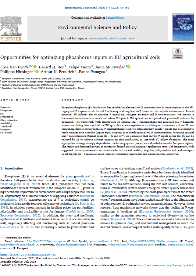 Reference: Van Eynde, E., Ros, G.H., Yunta, F., Muntwyler, A., Hinsinger, P., Fendrich, A.N. and Panagos, P., 2025. Opportunities for optimizing phosphorus inputs in EU agricultural soils. Environmental Science & Policy, 171: 104168.