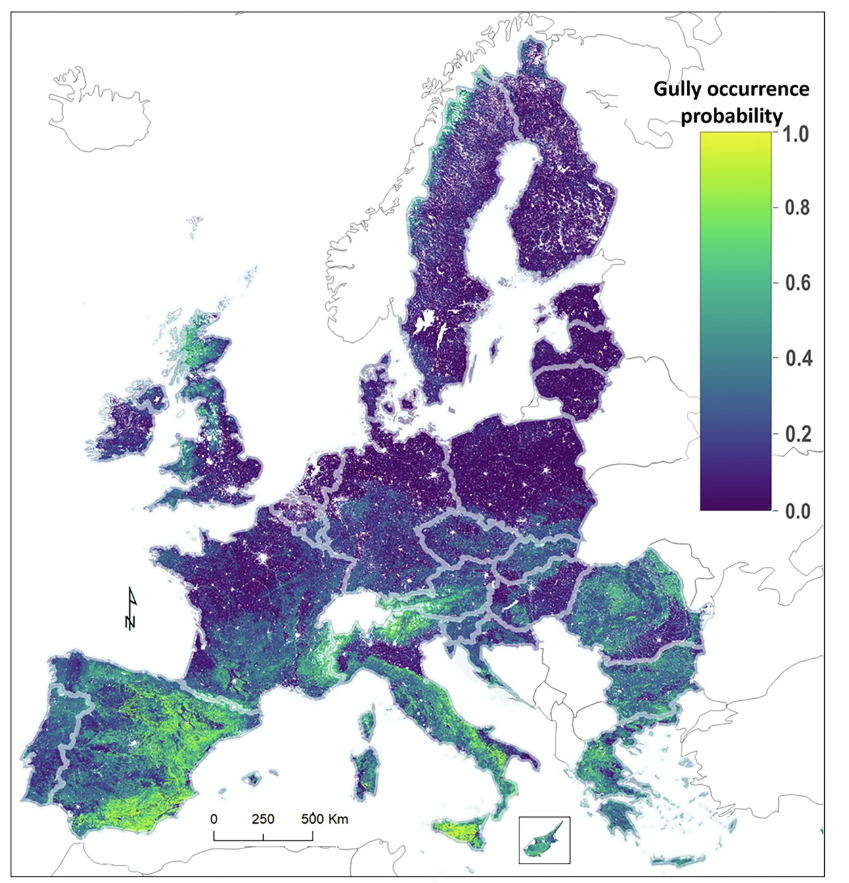 Modelling Gully Erosion in the EU with LUCAS The LUCAS 2022 survey extended the visual detection of gully erosion channels to all 399,591 locations of the monitoring grid across the EU. The survey focused on gully channels. LUCAS feature detection 2022 surveyed 399,591 locations through in situ (49.8%) and on-screen (50.2%) observations. Here we a predictive interpolation of the gully erosion channels probability across the EU and the U.K. In addition, point data with gully occurence (and pictures) are also available.Data are available here together with the scientific publication: Borrelli, P., Matthews, F., Alewell, C., Kaffas, K., Poesen, J., Saggau, P., Prăvălie, R., Vanmaercke, M., Panagos, P. 2025. A hybrid in situ and on-screen survey to monitor gully erosion across the European Union. Nature Scientific Data 12, 755 | |